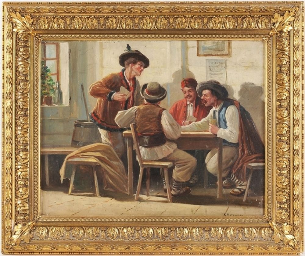 Lot 987. Moszynski, Stanislaw (1869 Sójki – 1907 Zakopane). Öl/ Lwd. Szene mit polnischen Bauern in traditioneller Kleidung beim Kartenspiel. R. u. sign. Maloberfläche mit l. Altersspuren, rest. 34 x 43,5 cm. Rahmen. Reserve 350 euro. Kunstauktionshaus Leipzig. 10/24/20. Sold 350 euro