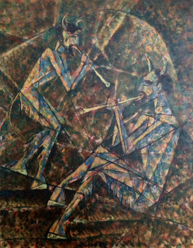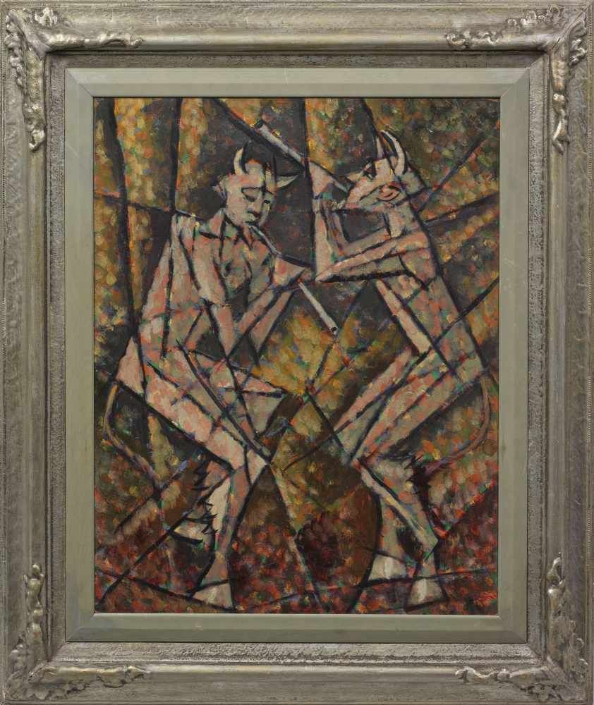Lot 1705. Jerzy Hulewicz (1886 Koscianki bei Strzalkowo/Polen – 1941 Warschau). Zwei Flöten spielende Faune. Kubistische Komposition mit kristallinen Flächen und einem sich überschneidenden, konturierenden Liniengerüst. Wohl um 1925-1930 entstandenes, in Motiv und Stil typisches Werk des polnischen Avantgarde-Künstlers. Hulewicz studierte zunächst an der Akademie in Krakau, 1907-1910 folgten Studienjahre in Paris und in der Schweiz, 1913 in München, wo er die aktuellen Kunstströmungen der Moderne kennenlernte. Bereits 1907 stellte er in Paris im Salon des Independants und im Salon d’Automne aus. 1917 gründete er die literarisch-künstlerische Zeitschrift “Zdrój”, die an die Berliner Avantgarde-Zeitschriften “Die Aktion” und “Der Sturm” anknüpfte. 1918 schloss er sich der Künstlergruppe “Bunt” (Revolte) an, die bis 1922 bestand und die Ideen des deutschen Expressionismus, des “Blauen Reiter” und der “Brücke” aufgriff. Seine auch vom Kubismus und Futurismus beeinflusste Kunst wird von scharfen Kontrasten, starker Geometrisierung der Konturen, dynamisch kollidierenden Diagonalen und prismatischen Ebenen bestimmt. 1926 ließ sich Hulewicz in Warschau nieder, wo er als Maler und Grafiker, Schriftsteller, Essayist und Kunstkritiker tätig war. Ein Großteil seines Oeuvres verbrannte während des Warschauer Aufstandes 1944. Öl/Malkarton. M. u. in der Darstellung sign.; Verso bez.; 70,5 cm x 55,5 cm. Rahmen. Oil on cardboard. Signed. Inscribed on the reverse. Starting 14,000 euro. Schloss Ahlden. 11/29/20. Sold 14,000 euro