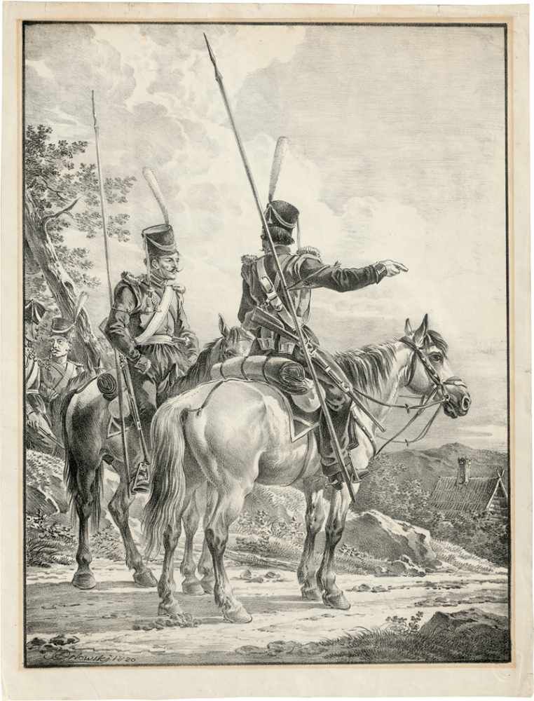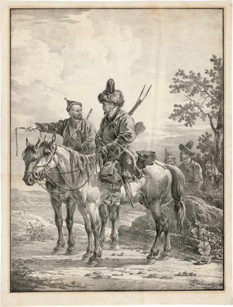 Orlowski war der erste Lithograph in Russland und seine Arbeiten gelten insbesondere in Russland als Inkunabeln dieser Technik. Dabei sind sie zweifellos von französischen Vorbildern inspiriert. Die beiden hier angebotenen, 1820 entstandenen Lithographien mit Darstellungen von orientalischen Reitern in pittoresker Tracht verraten profunde Kenntnisse der französischen, zeitgenössischen Kunst. Stilistische Anregungen durch Horace Vernet, Delacroix, Géricault sowie andere Meister der französischen Lithographie sind unübersehbar und dies bereits zu einem frühen Zeitpunkt, wenn man das Entstehungsdatum der Lithographien berücksichtigt. – Ganz ausgezeichneter, differenzierter Druck mit schmalem Rand um die Einfassungslinie. Etwas fleckig sowie im Passepartout-Ausschnitt leicht gebräunt, Randläsuren bzw. -einrisse, diese teils hinterlegt, rechts vertikale Knickspur, sonst in guter Erhaltung. Unten rechts mit dem Blindstempel des Künstlers (Lugt 5304). Opening 1,800 euro. Bassenge. 11/25/20