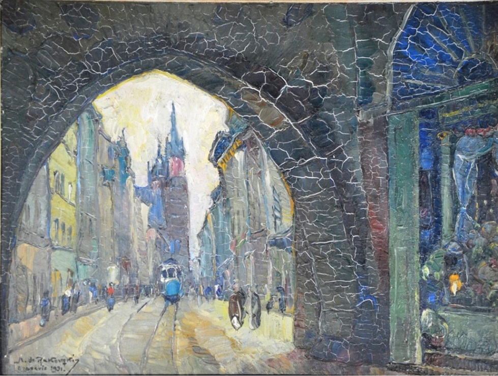 Lot 218. Mecislas DE RAKOWSKY (1882 1947). “Florianska Door“. Oil on panel signed lower left, located in Krakow and dated 1931. Label on the back of the gold fleece gallery. 26 x 34 cm (at sight). Estimate 300 – 500 euro. Sophie Himbaut. 12/16/20