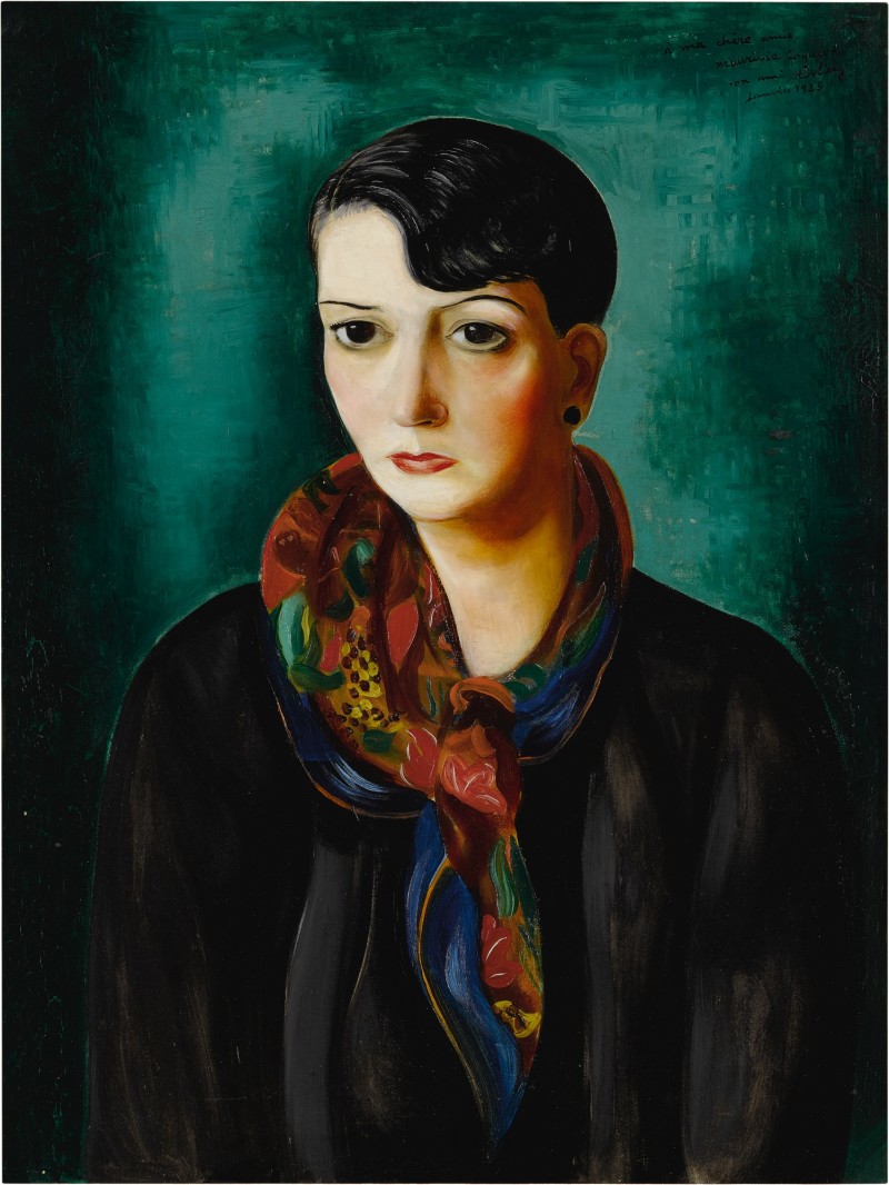 Lot 55. Moïse Kisling 1891 – 1953. Jeune femme au foulard. Dated janvier 1925 and dedicated à ma chère amie Mauricia Coquiot son ami Kisling (upper right). Oil on canvas, 28 3/4 by 21 1/2 in. (73 by 54.6 cm). Framed: 41 1/2 by 34 1/2 in. (105 by 87.6 cm). Painted in January 1925. Provenance: Mauricia Coquiot, Paris (acquired from the artist); Private Collection (and sold: Sotheby’s, Tel Aviv, April 11, 1996, lot 39); Private Collection, New York (acquired at the above sale and sold: Sotheby’s, New York, December 18, 2007, lot 50); Acquired at the above sale by the present owner. Literature: Jean Kisling, Kisling, 1891-1953, vol. I, Paris, 1971, no. 58, illustrated p. 154; Joseph Kessel, Kisling, New York, 1971, illustrated p. 110. Estimate 50,000 – 70,000 euro. Sotheby’s. 12/14/20. Sold $94,500