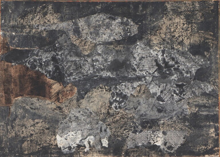 Lot 988. HENRYK MUSIALOWICZ (1914 Gniezno – 2015 Warschau). Federzeichnung auf Papier (auf Pappe montiert)/Papiercollage, ”Fonds de Mer”, oben rechts signiert ”HMusialowicz”, verso handschriftlich (wohl vom Kuenstler) mit Adresse versehen und betitelt, ca. 48,5×67,5xcm, ungerahmt (auf Platte montiert), berieben. Starting 450 euro. Rotherbaum. 12/12/20. (20120019)