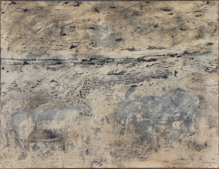 Lot 989. HENRYK MUSIALOWICZ (1914 Gniezno – 2015 Warschau). Federzeichnung auf Papier (auf Pappe montiert), ‘‘Paysage” (1967), unten rechts signiert ”HMusialowicz” und datiert, verso handschriftlich (wohl vom Kuenstler) mit Adresse versehen und betitelt, ca. 48,5×67,5xcm, ungerahmt (auf Platte montiert), berieben, Ecke oben links mit Knickspur. Starting 450 euro. Rotherbaum. 12/12/20. (20140019)