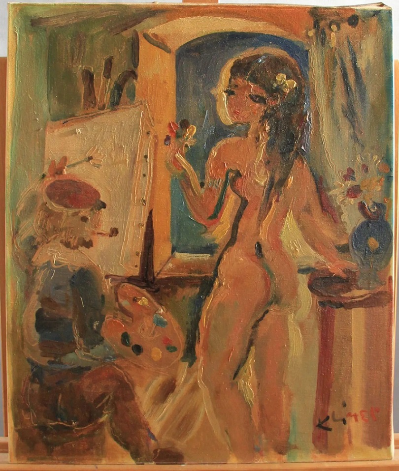 Lot 43. KLIMEK (1912-1992), Le peintre et son modèle, Huile sur toile signée en bas à droite. – 55x48cm. Estimation 300 – 500 €. Hotel des Vendes Montpellier. 01/29/20
