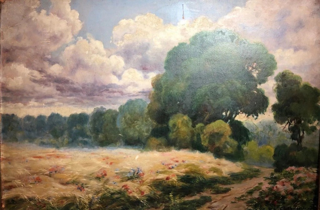 Lot 435. WOTOSZYRISKI ( Ecole Polonaise début 20è siècle ). Le champ de blé. Huile sur carton portant une signature Wotoszyriski et une date (1)922 en bas à droite. 49,5 x 72 cm. Manques de peinture, vendu en l’état. Estimation 100 – 200 €. HOTEL DES VENTES D’EVREUX. 01/31/21