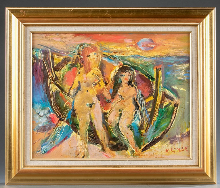Lot 259. Klimek, Ludwig (Polish, 1912-1992). Untitled expressionistic style depiction of two nudes. 20th century. Oil on paper/ cardboard. Signed l.r. 13″ x 16″. Frame: 17 3/4″ x 21″. Provenance: From the estate of a private collector, Potomac, Maryland. Estimate $300 – 500. Quinn’s Auction Galleries. 01/30/21