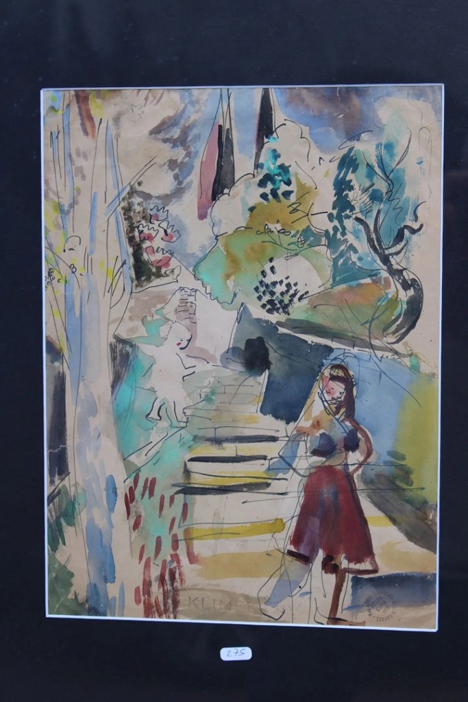 Lot 275. KLIMEK Ludwig (1912 – 1992). Femme et enfant en bas des marches, aquarelle et traits de plume, cachet de la vente à droite, et de l’atelier à gauche – 33.5 x 24.5 cm. Estimate150 – 200 €. MICHEL DARMANCIER & OLIVIER CLAIR. 02/04/21