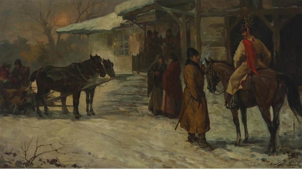 Lot 472. MARIAN SZCZUGOWSKI (20TH CENTURY), POLISH. OUTSIDE A VILLAGE TAVERN. Oil on canvas; signed lower right, 23 ins x 41 ins; 58.4 cms x 104.1 cms. Provenance: Britnell’s Art Galleries, Toronto, Diamond Jubilee label to the backing paper; Waddington’s Auctioneers and Appraisers, Toronto, 14 June 2011, lot 281, from the Estate of Taimi Cushing, ON; Private Collection, Toronto. Note: A student of Jan Matejko. Estimate: $1,500—2,500. Waddington‘s. 02/18/21