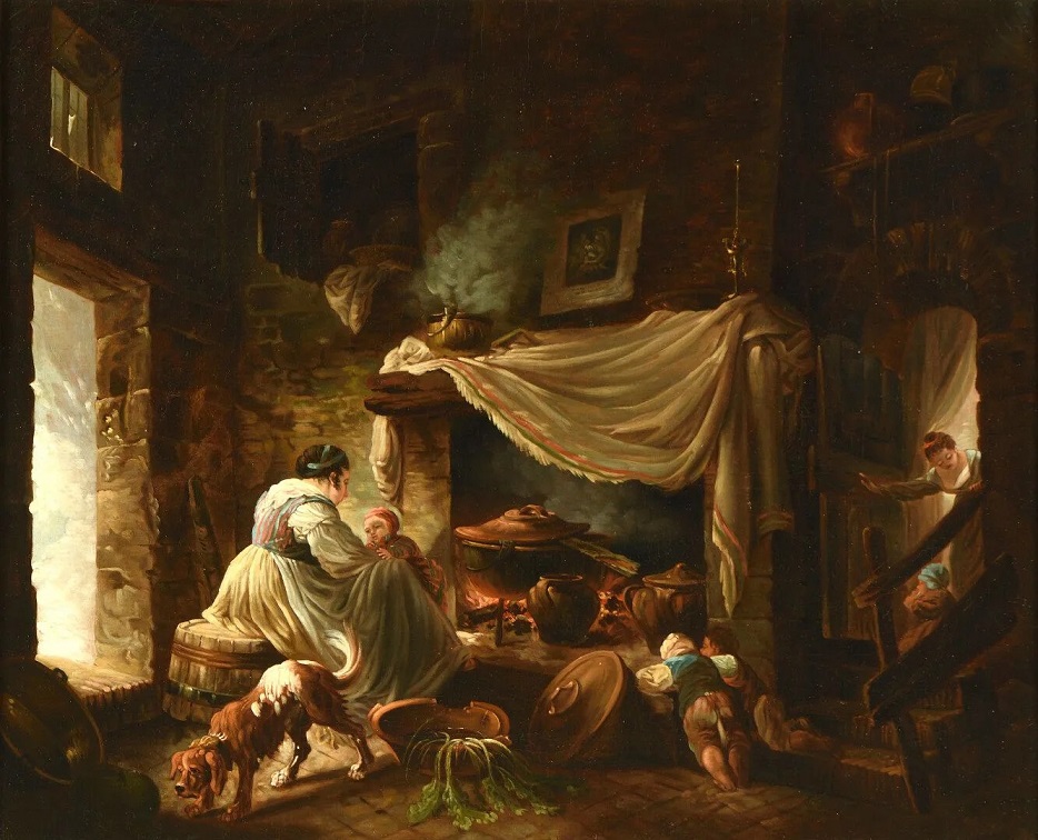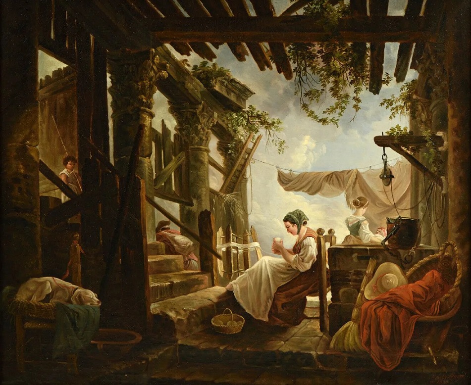 Ces tableaux sont des reprises, de même dimension, des compositions d’Hubert Robert acquises au 18e siècle par le roi Stanislas Auguste pour le Palais Lazienki à Varsovie; la “Cuisine italienne” est toujours aujourd’hui Musée National de cette ville.