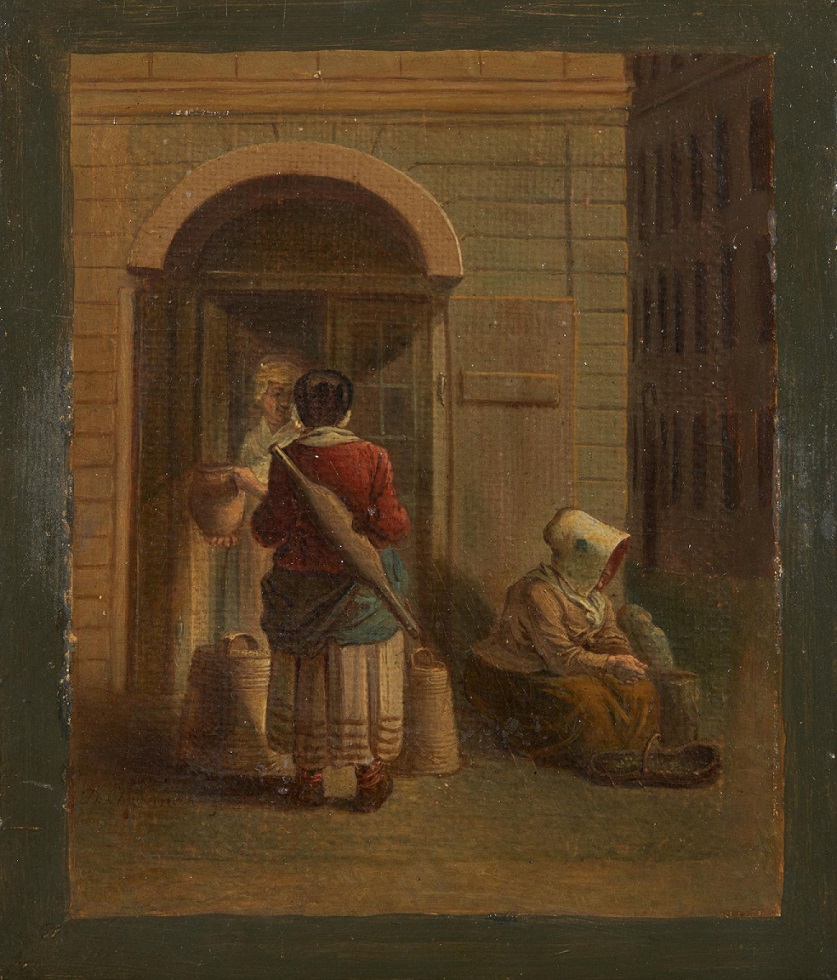Amélia LEPIGE (Amélie Pfanhauser née) (Varsovie ? vers 1819 – morte vers 1900). “Femme dévidant du fil dans les ruines d’un temple – Femme et enfants devant une cheminée“. Paire de toiles d’origine. 61 x 74 cm. L’une signée en bas à droite et datée 1836. L’autre porte une signature “Robert” et une date 1792. Cadres en bois et stuc doré à décor de candélabres de palmettes affrontées feuillagées d’époque Restauration.(Accidents et manques aux cadres)