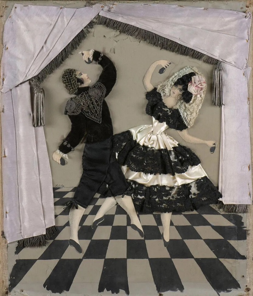Lot 128. Alicja/Alice HALICKA (Cracovie 1894 – 1975 Paris). Danse espagnole. Collage: encre de chine sur papier (petit accident), tissu, dentelles. Signé en bas à gauche. 65 x 54 cm. On oublie parfois qu’Alice Halicka, talentueuse peintre vivant dans l’ombre de son mari Marcoussis, avait aussi un tempérament de décoratrice. Il s’agit de la personne qui a dessiné des papiers peints, qui a décoré l’appartement d’Helena Rubinstein à New York, qui a collaboré avec Stravinsky sur la scénographie de ses ballets et qui a créée dans les années 20 une série originale de compositionscollages. Ces oeuvres tridimensionnelles étaient assemblées avec des morceaux de papier, avec du tissu, avec des boutons, avec des dentelles et avec des plumes. Exposées pour la première fois en 1925, elles ont surtout connu un succès lors de la présentation à la Galerie George Petit en 1930. C’est la Princesse Murat qui a écrit la préface du catalogue, et c’est elle qui a baptisé cette création de Halicka « Romances capitonnées ». Estimate 2 000 – 3 000 €. Oger & Blanchet. 03/19/21. Sold 9,200 euro