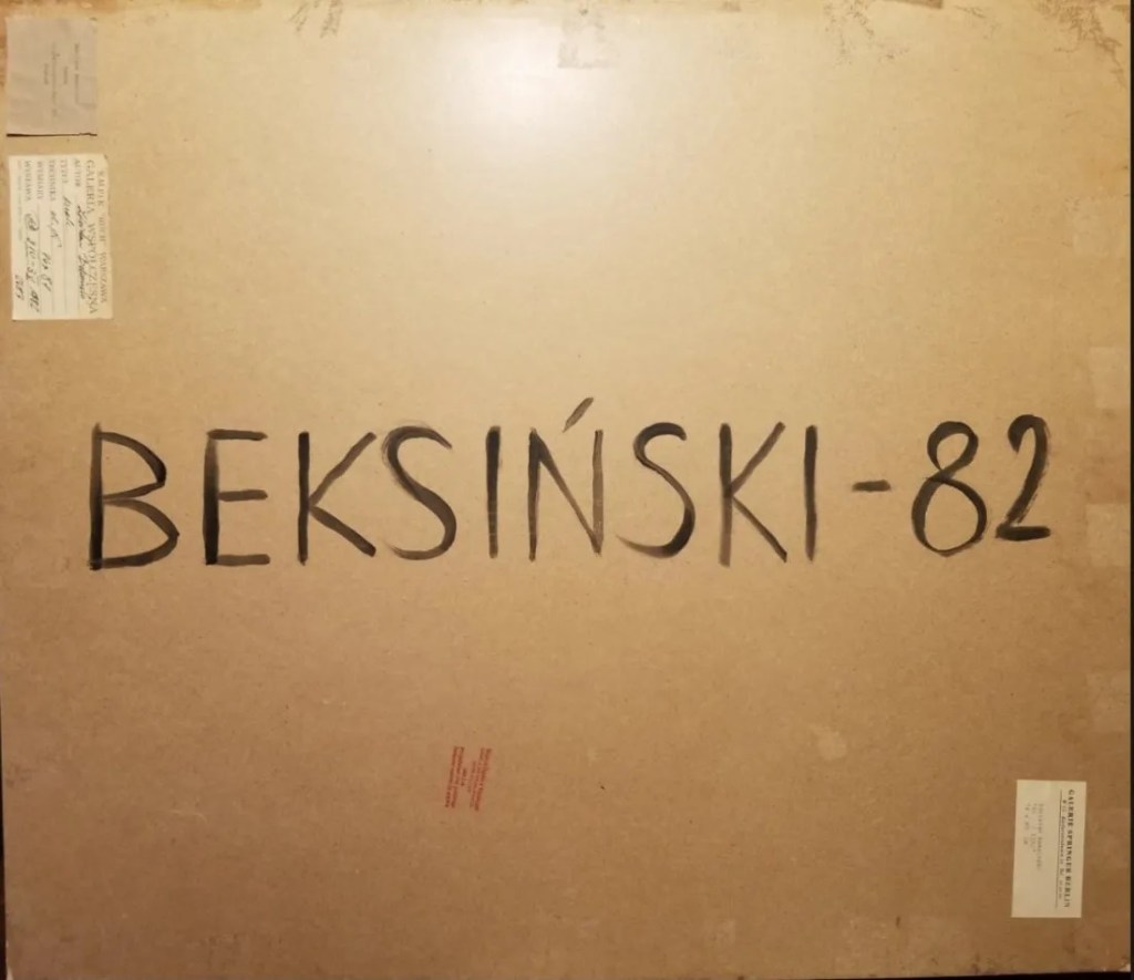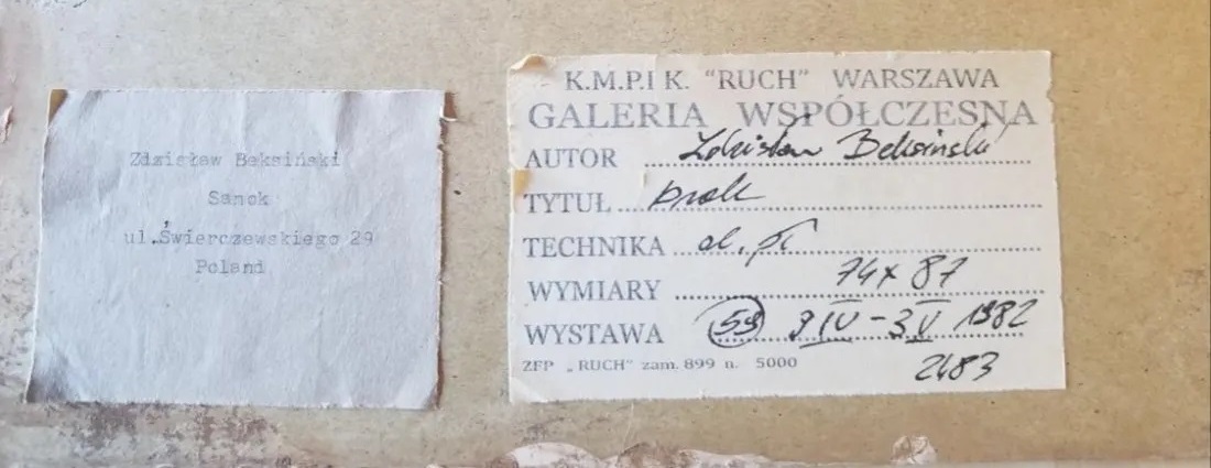 Dodałem nalepkę z prawdziwej wystawy nr 59, prac Zdzisława Beksińskiego jaka odbyła się w 1970 roku (https://sztuka.agraart.pl/search/20/brak/wszystkie/0/3100000/wszystkie/data-aukcji/malejaco/12/14). Wystawa nr 59 nie mogła odbyć się w 1982 roku. Proszę przypatrzeć się datom na obydwu nalepkach. Dodatkowo dowiedziałem się, że p. Piotr Dmochowski źle wypowiedział się o tej pracy z nadchodzącej aukcji. (03/08/21)