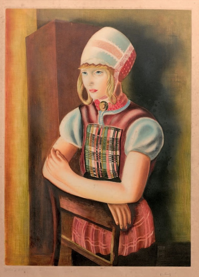 Lot 156. Moïse KISLING (1891-1952). YOUNG GIRL IN DUTCH COSTUME. Aquatint in colour, signed lower right in pencil, annotated artist’s proof lower left. On view: 65 x 46.5 cm. Estimate 1,500 – 2,000 euro. Jean Marc Jelvaux. 03/16/21