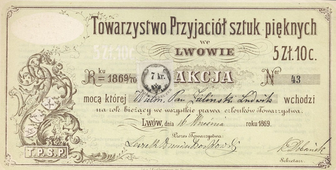 Tym razem zamiast pracy malarskiej przedstawiam rzecz związaną z lwowskim Towarzystwem Przyjaciół Sztuk Pięknych. Jest to niezwykle rzadki kupon potwierdzający przyjęcie Wielmożnego Pana Zielińskiego Ludwika w dniu 16 września 1869 roku w skład członkówTPSP. Na kwicie mamy dwie sygnatury założycieli TPSP we Lwowie: Prezesa TPSP hrabiego Leszka Dunin Borkowskiego (m.in. adiutanta gen. Krukowieckiego w Powstaniu Listopadaowym) oraz sekretarza Konstantego Dzbańskiego. Ciekawe są życiorysy obu postaci.