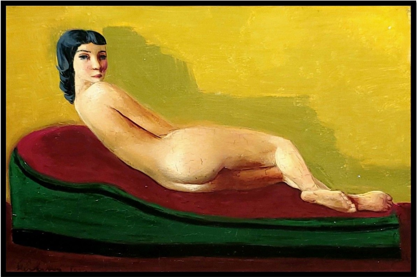 Lot 40. KISLING Moses 1891-1953: Small nude on a sofa, 1951. Oil on canvas SBG and dated 22×33 cm. Certificate of Mr Chanoit-expert. Provenance : Gal de la Présidence-Paris. Bibliography: Catalogue Raisonné P302 n°94. Estimate 35,000 – 40,000 euro. Chaville Encheres. 04/11/21