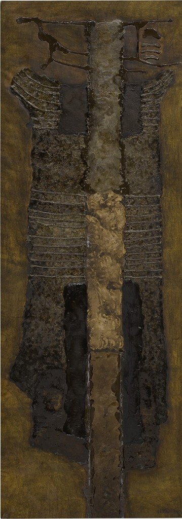 Lot 54. Jan Lebenstein 1930 – 1999. Axial Figure #38, signed J. Lebenstein and dated 59 (lower right), oil and acrylic on canvas, canvas: 63 by 23 inches (160 by 58.4 cm). Provenance: Galerie Chalette, New York. Joseph H. Hirshhorn, New York. Gift to the present owner, 1966. Estimate $25,000 – 35,000. Sotheby’s. 04/06/21. SOld $75,600