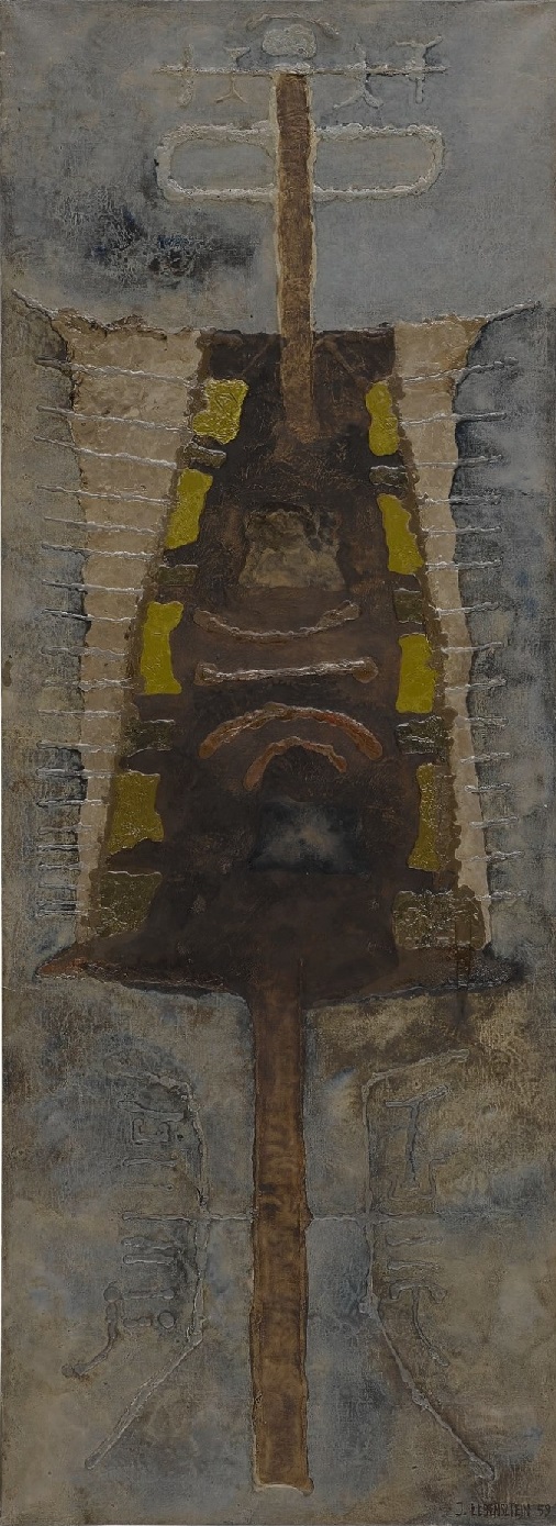 Lot 70. Jan Lebenstein 1930 – 1999. Axial Figure #76, dated 1960 and titled (on the stretcher), oil on canvas, canvas: 78 ⅞ by 27 ⅝ inches (200.3 by 70.2 cm), framed: 80 ½ by 29 ⅛ inches (204.4 by 73.9 cm). Provenance: Galerie Chalette, New York; Joseph H. Hirshhorn, New York; Gift to the present owner, 1966. Sold by the Order of the Trustees of the Hirshhorn Museum and Sculpture Garden to Benefit its Acquisition Program. Estimate $25,000 – 35,000. Sotheby’s. 04/06/21. Sold $69,700
