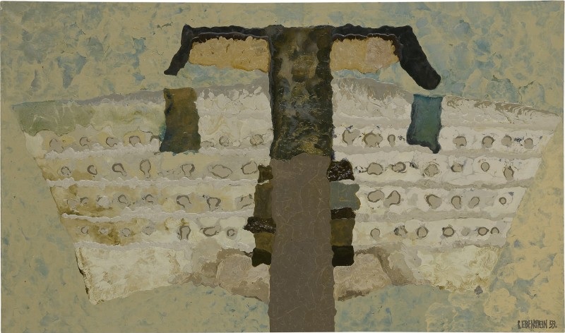 Lot 6. Jan Lebenstein 1930 – 1999. Axial Figure, signed Lebenstein and dated 59 (lower right), oil and acrylic on canvas, canvas: 26 ¾ by 45 ½ inches (67.8 by 115 cm), framed: 27 ½ by 46 ⅛ inches (69.8 by by 117 cm). Provenance: Galerie Chalette, New York. Joseph H. Hirshhorn, New York. Gift of the above, 1966. Estimate $25,000 – 35,000. Sotheby’s. 04/06/21. Sold $60,480
