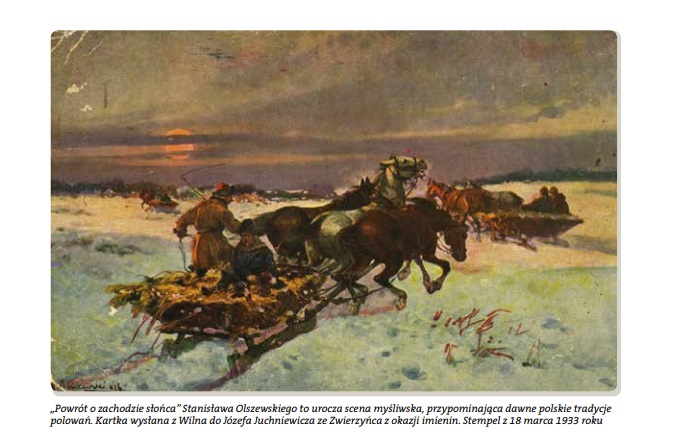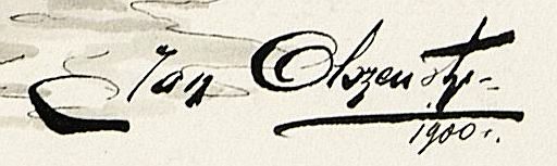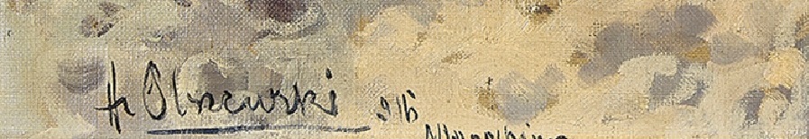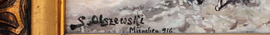 W katalogu szwajcarskiej firmy Dobiaschofsky pojawił się obraz opisany jako ręki Jana Gwalberta Olszewskiego, sygnowany, datowany (1916 rok) oraz podpisany miejscem powstania (Monachium – prawdę powiedziawszy polegam w tym przypadku na opisie katalogowym bo widzę jedynie fragment tego napisu). Obraz przedstawia grupę ludzi w zaśnieżonym lesie, przygotowujących się do polowania. Obraz taki mógłby namalować Julian Fałat, Adam Setkowicz, Stanisław Gibiński, Jan(?) Konarski, etc., czyli artyści związani ze szkołą monachijską. Doszedł obecnie do szkoły monachijskiej Jan Gwalbert Olszewski, który nigdy nie studiował w Monachium a wręcz odwrotnie, związany był z Akademią Petersburską. Wg. opisu biograficzngeo, artysta ten od 1913 roku aż do 1939 roku byl nauczycielem w warszawskim Liceum im Batorego. W jego twórczości nie ma obrazów typu ‘monachjijskich’. Takie nieścisłości zdarzają sie oczywiście w opisach katalogowych firm zagranicznych, błędne odczytanie czy przypisanie sygnatury…ale czy tylko u firm zagranicznych? Poniżej więcej o tym.