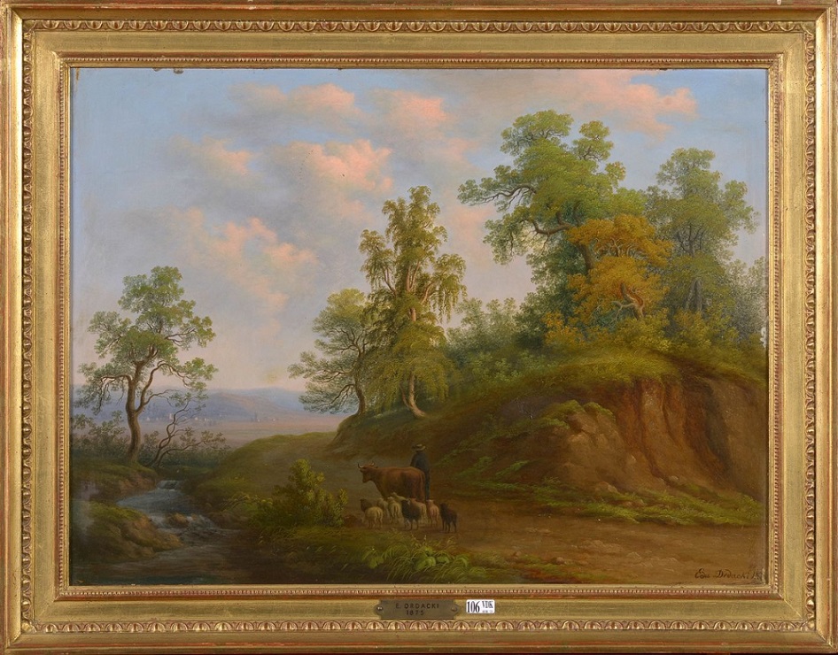 Lot 106. DRDACKI Edward (c. 1830 – c.1890). Huile sur cuivre “Berger et son troupeau sur fond de paysage“. Signé en bas à droite E. Drdacki et daté 1873 ou 1875. Ecole de l’Est. (Légers écaillements). Dim.:+/-48,4×64,5cm. Estimate 400 – 600 euro. Vanderkindere. 04/20/21