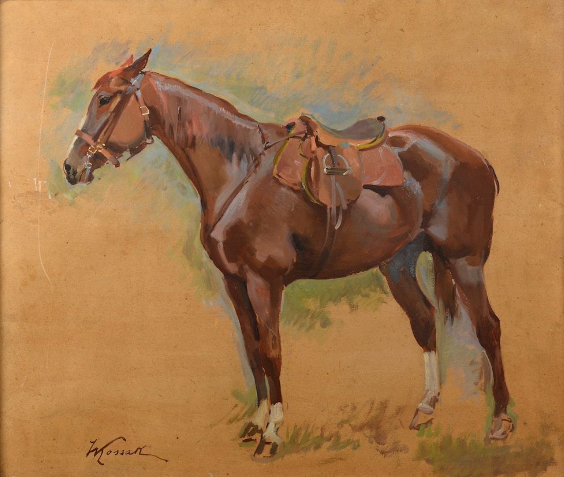 Lot 42. Jerzy KOSSAK (Cracovie, 1886 – 1955). Cheval sellé. Huile sur carton signée en bas à gauche (griffure). Haut. : 59,5 cm – Larg. : 70,5 cm. Estimate 200 – 400 euro. Le Floch. 05/09/21
