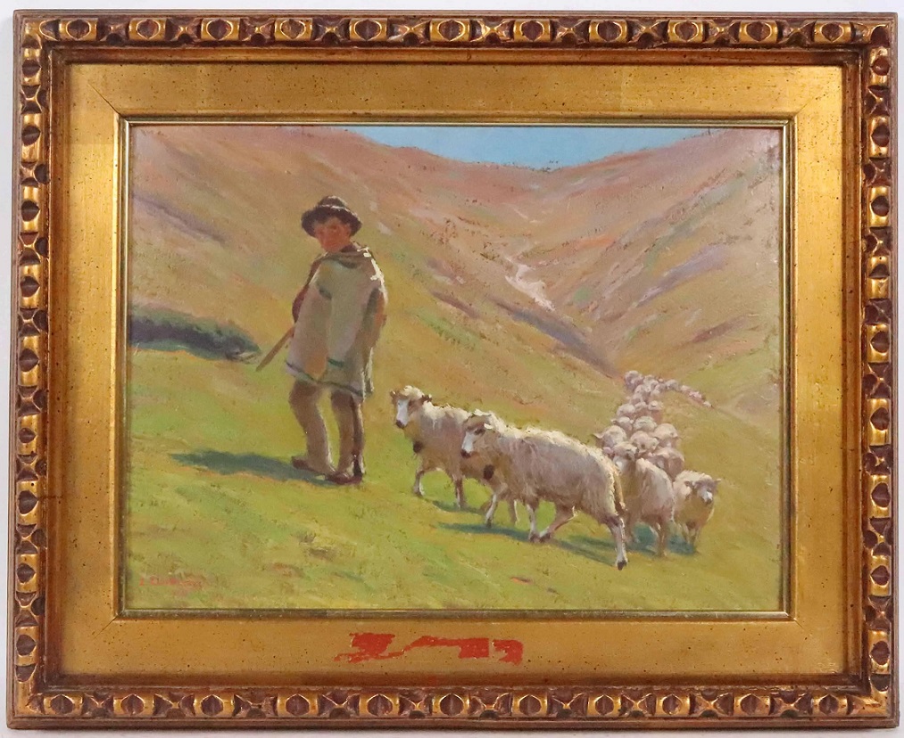 Lot 159. Zefiryn Cwiklenski, Oil on Board, Shepherd (Polish, 1871-1930) signed l.l., depicting a shepherd leading his sheep through a valley. Sight size: 11″h x 15-1/4″w. Overall: 16-3/4″h x 20-1/2″w. Estimate $600 – 900. Nye. 06/02/21. Sold $425