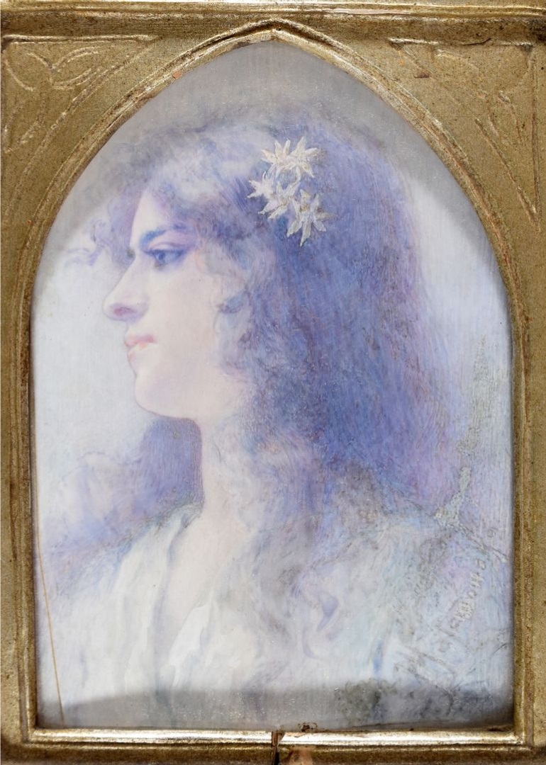 Lot 319. MATAWOWSKA, Jadwiga. Buste de jeune femme de profil g., fleurs dans les cheveux. Peinture, forme ogivale Ø 14 x 10 cm (à vue), sur ivoire, signée en bas à dr. Sous cadre d’origine de style néo-gothique en bois argenté (fente dans le bas), pied chevalet (non désencadrée). Estimate 800 – 1,200 euro. Arenberg Auctions. 06/17/21