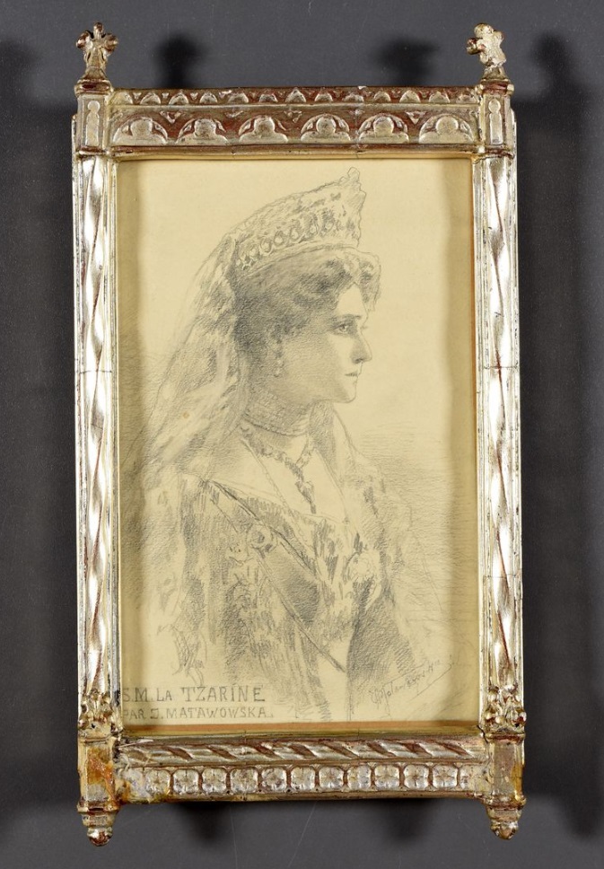 Lot 320. MATAWOWSKA, Jadwiga. La tsarine de Russie Alexandra Feodorovna, buste de profil dr. Dessin, mine de plomb, 21 x 12,8 cm (à vue), papier, titré “S.M. LA TZARINE/ PAR J. MATAWOWSKA” en bas à g. et signé en bas à dr. à la mine de plomb. Sous cadre d’origine de style néo-gothique en bois argenté, doublé de tissu, pied chevalet (non désencadré). Dessin d’après la photographie officielle de la tsarine (1872-1918) portant tiare et collier de perles. Estimate 1,300 – 2,000 euro. Arenberg Auctions. 06/17/21