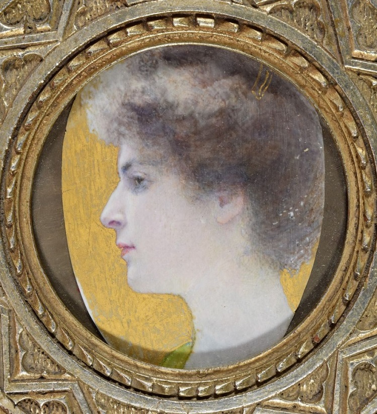 Lot 318. MATAWOWSKA, Jadwiga. Buste de femme de profil dr.; cheveux noirs en chignon et grande lavallière blanche au cou. Peinture, 12 x 8 cm, sur ivoire, signée en bas à dr. (pet. fente peu dérangeante sur 1 cm dans le chignon). Sous cadre d’origine de style néo-gothique en bois doré, pied chevalet (non désencadrée). Portrait présumé de la cantatrice polonaise Teresa Selenka ayant interprété Alba Albata. L’artiste d’origine polonaise Jadwiga Matawowska (1874-1963) arriva très jeune en France où elle suivit les cours de Jules Le Febvre. Elle fut découverte au Salon des artistes français et récompensée d’une médaille d’or en 1899. Elle est surtout connue comme portraitiste des aristocrates et membres de familles royales en Belgique (Albert Ier en 1914, Élisabeth, la comtesse de Flandre, etc.), Pologne, France, Allemagne, Russie, etc. Estimate 800 – 1,200 euro. Arenberg Auctions. 06/17/21