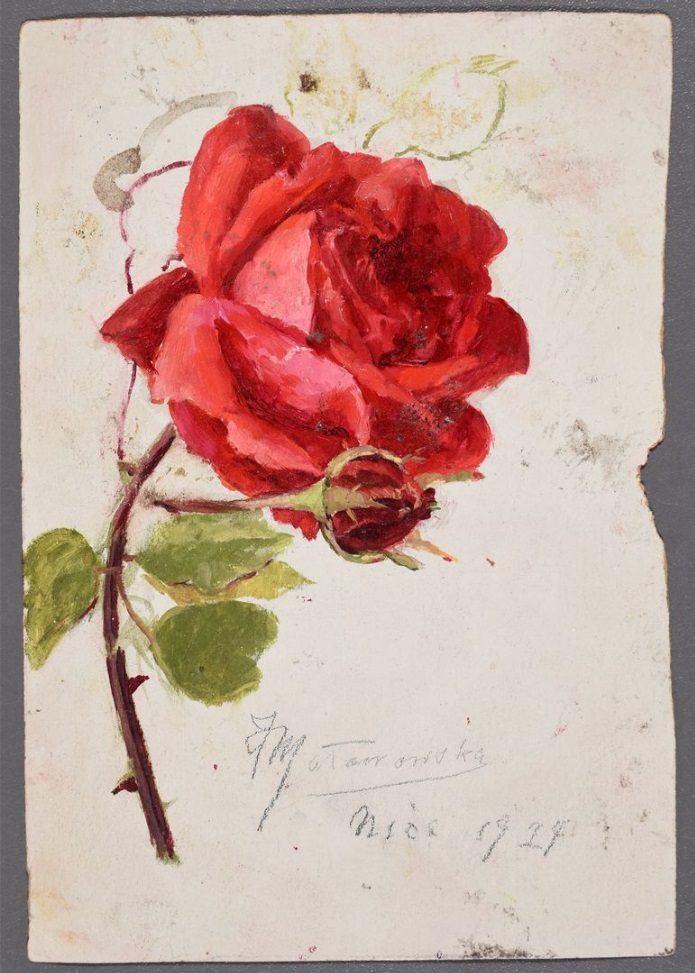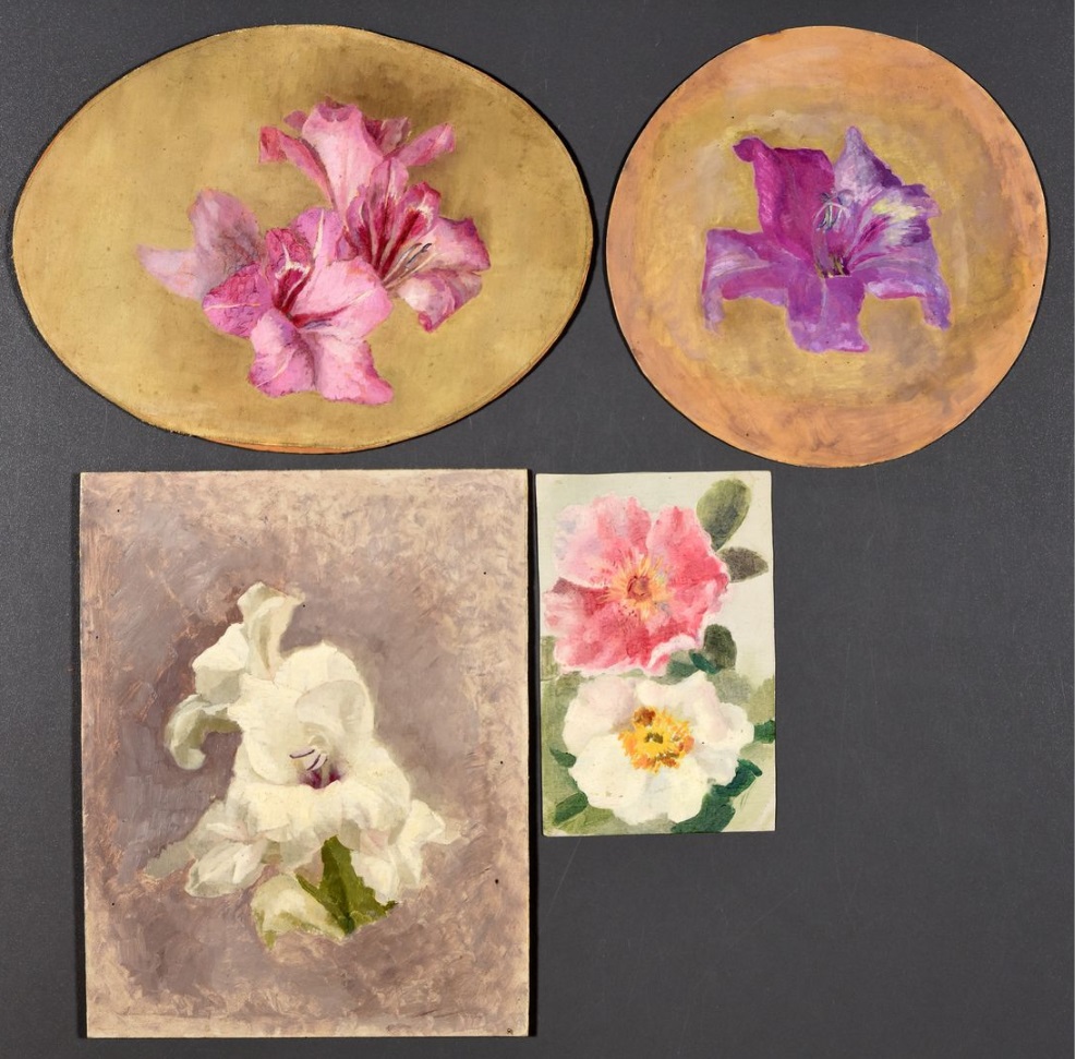 Lot 323. MATAWOWSKA, Jadwiga. 27 Compositions de fleurs (roses, oeillets, hortensias, mimosas, orchidées…). Peintures à l’huile ou pastels, sur morceaux de toile, carton ou papiers de couleur, formats divers (rond, carré, ovale…) mais assez petites (± 20 x ± 15/10 cm), 4 signées et 1 datée 1924. Sur cette artiste, voir aussi le numéro 730. Estimate 250 – 400 euro. Arenberg Auctions. 06/17/21