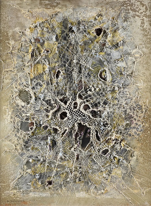 Lot 356. ZDZISLAW SALABURSKI (Polish 1922-2006) A PAINTING, “Kompozycja,” WARSAW, 1965-1968, oil and mixed media on canvas, signed and dated L/R, “Z. Salaburski 1968,” verso on the canvas in black ink, “Z. Salaburski 1965 Warszawa,” the stretcher with hand inscribed partial labels. 39 1/2″?x 29 5/8″ Provenance: From the Estate of Michael Freels, Houston, Texas. Estimate $800 – 1,200. Simpson Galleries. 06/12/21
