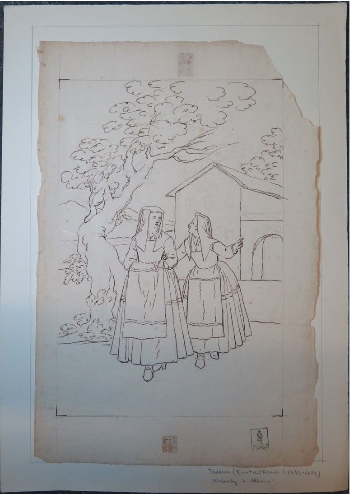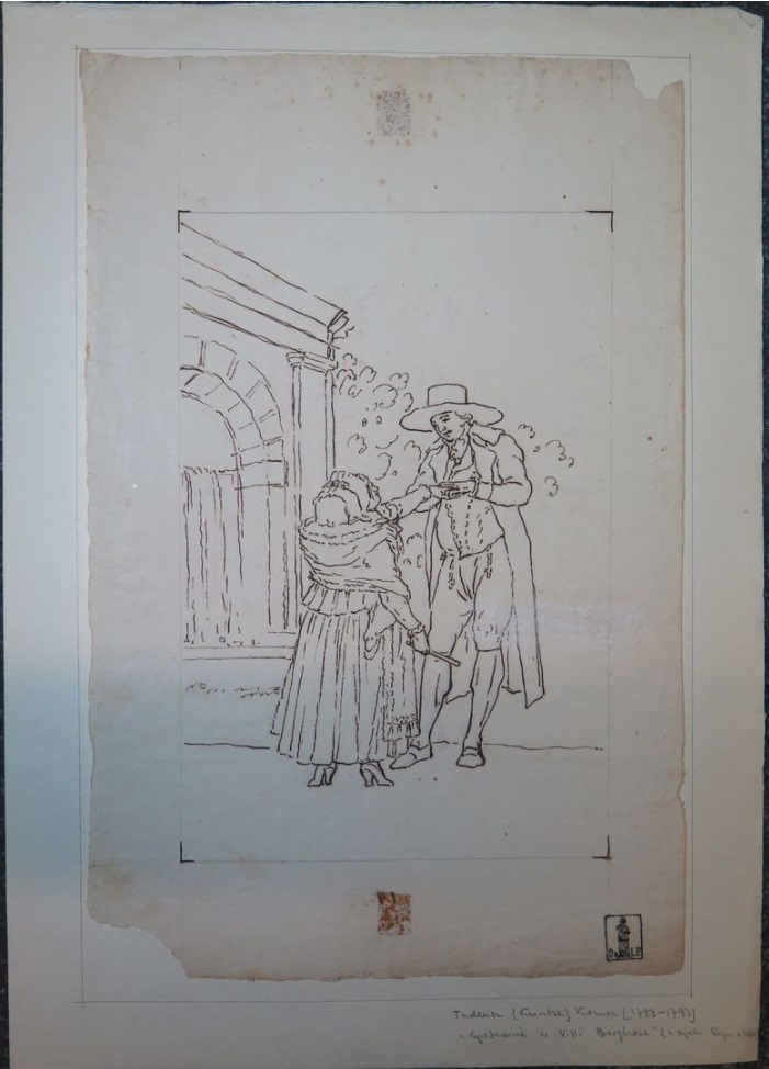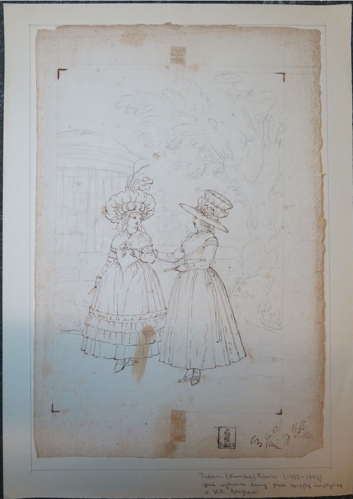 Lot 63. Tadeusz KUNTZE, dit aussi Taddeo POLACCO Zielona-Gora, 1727- Rome, 1793. The duchess of Brunswick wandering in the garden of the villa Borghese, pen and brown ink, black chalk, inscribed, by T. Kuntze, 44 x 28,50 cm (17,32 x 11,22 in.). Provenance : Collection Ludwig Pollak, son cachet (L.788b) à deux reprises en bas à droite ; Collection Witold Zahorski ; Puis par descendance. Bibliographie : Zuzanna Prószynska, «Kuntze, Tadeusz», in ‘Slownik artystów polskich i obcych w Polsce dzialajacych’, t. IV, Wroclaw, 1986, p. 372. Dariusz Dolanski, ‘Tadeusz Kuntze – malarz rodem z Zielonej Góry (1733-1793)’, Zielona Góra, 1993, p. 87, n° 196. Paolo Erasmo Mangiante, ‘Goya e Italia’, Saragosse, 2008, p. 173 et p. 184, note 11, et p. 282. Kamila Szparkowska, ‘Tadeusz Kuntze, il Taddeo polaco, el gran pintor europeo del siglo XVIII y sus conexiones con España’, thèse de doctorat, Madrid, Universidad Complutense, 2015-2017, p. 749. Estimate 1,000 – 1,500 euro. Artcurial. 06/09/21. Sold 1,500 euro