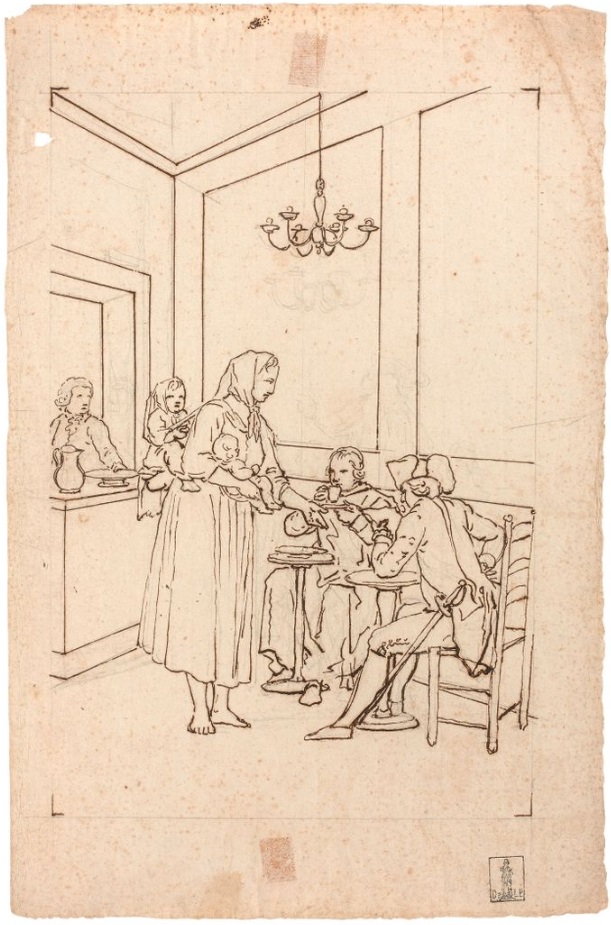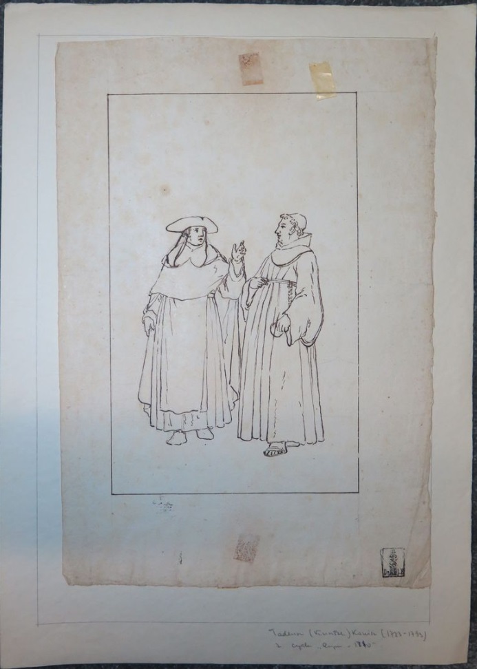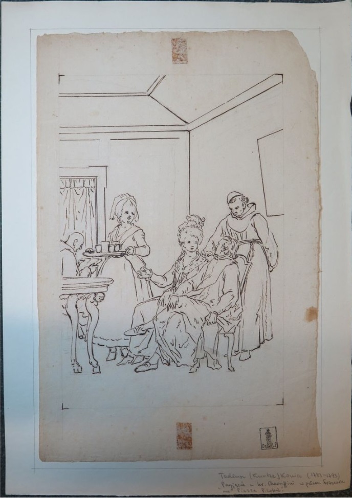 Lot 65. Tadeusz KUNTZE, dit aussi Taddeo POLACCO Zielona-Gora, 1727- Rome, 1793. The cafe Greco, pen and brown ink, black chalk, inscribed, by T. Kuntze. On joint neuf autres dessins du même artiste. Ensemble de 10 dessins. Sans cadres 43,50 x 29 cm (17,13 x 11,42 in.). Provenance : Collection Ludwig Pollak, son cachet (L.788b) en bas à droite ; Collection Witold Zahorski ; Puis par descendance. Bibliographie : Maciej Loret, «Nieznane prace Tadeusza Kuntzego w Rzymie», in ‘Dawna Sztuka’, II, Lviv, 1939, p. 123, fig. 4. Janusz Koniusz, ‘Taddeo Polacco z Zielonej Góry’, Zielona Góra, 1960, p. 19, repr., Zuzanna Prószynska, «Kuntze, Tadeusz», in ‘Slownik artystów polskich i obcych w Polsce dzialajacych’, t. IV, Wroclaw, 1986, p. 372. Dariusz Dolanski, ‘Tadeusz Kuntze – malarz rodem z Zielonej Góry (1733-1793)’, Zielona Góra, 1993, p. 88, n° 206. Paolo Erasmo Mangiante, ‘Goya e Italia’, Saragosse, 2008, p. 173, p. 184, note 11. Kamila Szparkowska, ‘Tadeusz Kuntze, il Taddeo polaco, el gran pintor europeo del siglo XVIII y sus conexiones con España’, thèse de doctorat, Madrid, Universidad Complutense, 2015-2017, p. 750 et repr. p. 754 et p. 758. Estimate 4,000 – 6,000 euro. Artcurial. 06/09/21. Sold 6,000 euro