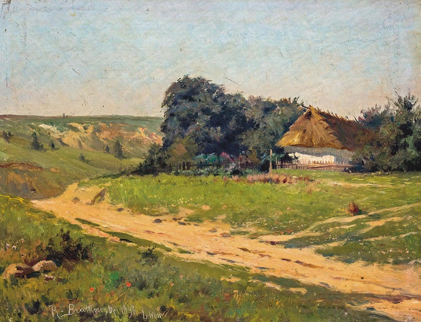 Niezły, choć nieduży obrazek Romana Bratkowskiego przedstawiający zagrodę z okolic Lwowa (może to zaścianek?) był licytowany na Węgrzech. Warto szperać u Madziarów.