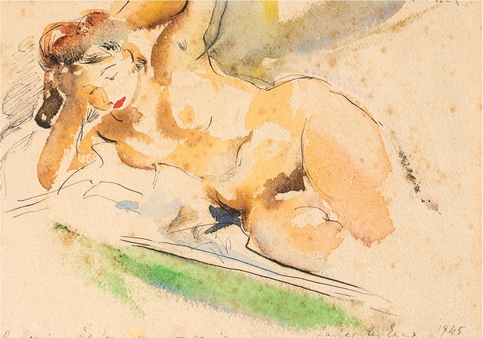 Lot 41. LUDWIK KLIMEK (1912-1992). Reclining nude. Watercolour on paper, signed upper right, dedicated, fading 18 x 25 cm (on view). Estimate 100 – 200 euro. Boisgirard. 06/23/21
