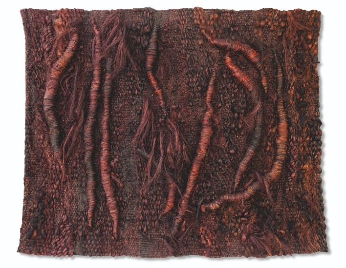 Lot 581. MAGDALENA ABAKANOWICZ (1930-2017). Relief sombre de stefa, signed twice, titled and dated ‘MAGDALENA ABAKANOWICZ “RELIEF SOMBRE DE STEFA” 1975 M. Abakanowicz’ (on a label stitched to the reverse), dyed woven sisal, 41 3/8 x 51 1/8in. (105 x 130cm.). Executed in 1975. Provenance: Private Collection. Anon. sale, Agra Art Warsaw, 18 October 2016, lot 15. Acquired at the above sale by the present owner. Estimate 40,000 – 60,000 GBP. Christie’s. 07/02/21. Sold 53,750 euro
