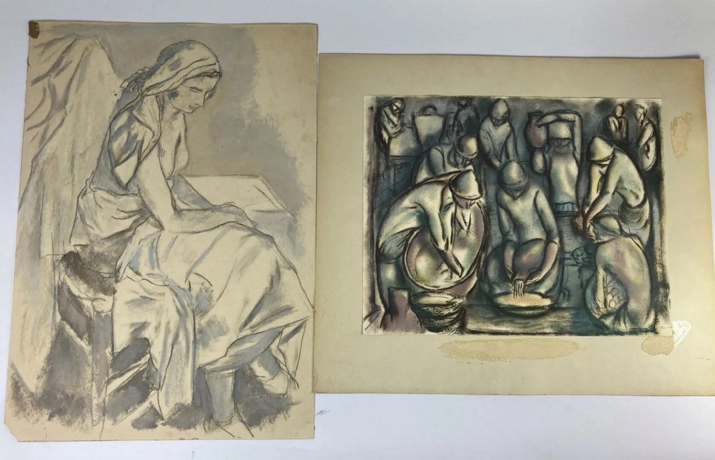 Lot n°251. Léopold GOTTLIEB (1883-1934). Femme drapée assise. Dessin réhaussé de gouache, annoté au revers. Haut. : 51 cm – Larg. : 35 cm On joint : Léopold GOTTLIEB (1883-1934). Le verseur d’eau. Procédé dans les tons vert, bleu et mauve, porte une annotation au dos. Haut. : 29,5 cm – Larg. : 37,5 cm. Estimation : 40 – 60 €. SARL OEP – OUEST ENCHERES PUBLIQUES. 07/01/21