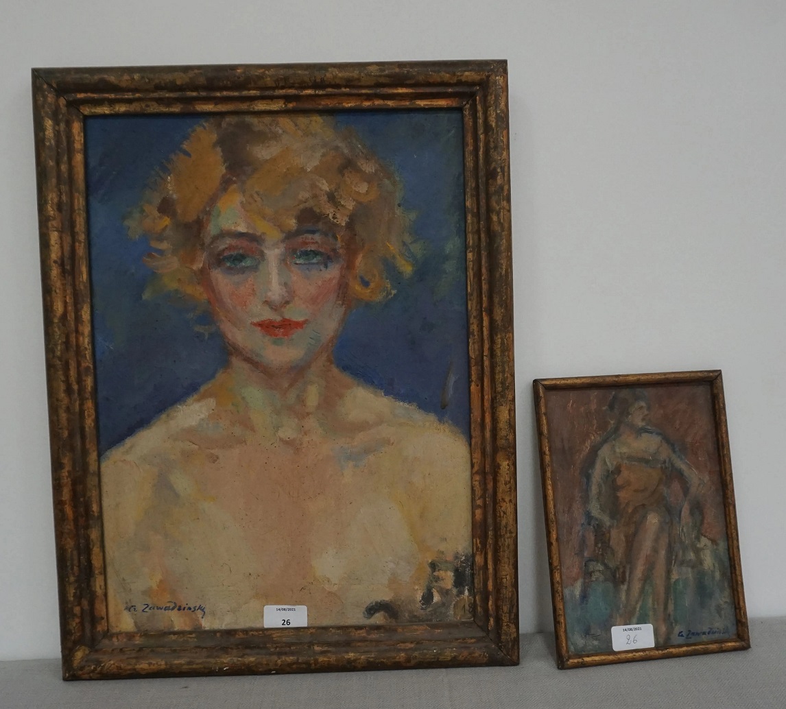 Lot 26. Czeslaw ZAWADZINSKY (Varsovie 1878 – 1956). “Blonde sur fond bleu“. Huile sur toile signée en bas à gauche. 46 x 33cm. On joint du même auteur”Femme”. Huile sur carton signée en bas à droite. 24 x 16cm. LAURENT Etienne. Estimate 200 – 250 €. SARL VICHY ENCHERES. 08/14/21.