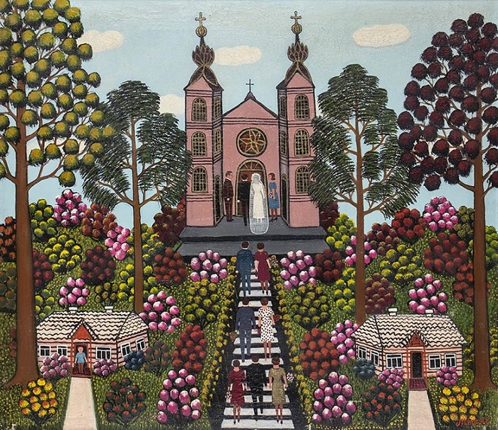 Lot 482. MARIA KORSAK (Pologne, 1908 – 2002). Mariage, 1981. Huile sur toile, 70 x 80 cm. Signé en bas à droite : M. Korsak ; Etiquette au dos de Expò Arte, Foire internationale d’art contemporain, Bari, 1981. Bon état, cadre sans verre. Estimate 400 – 600 euro. Bertolami Fine Arts. 09/16/21. Sold 1,100 euro