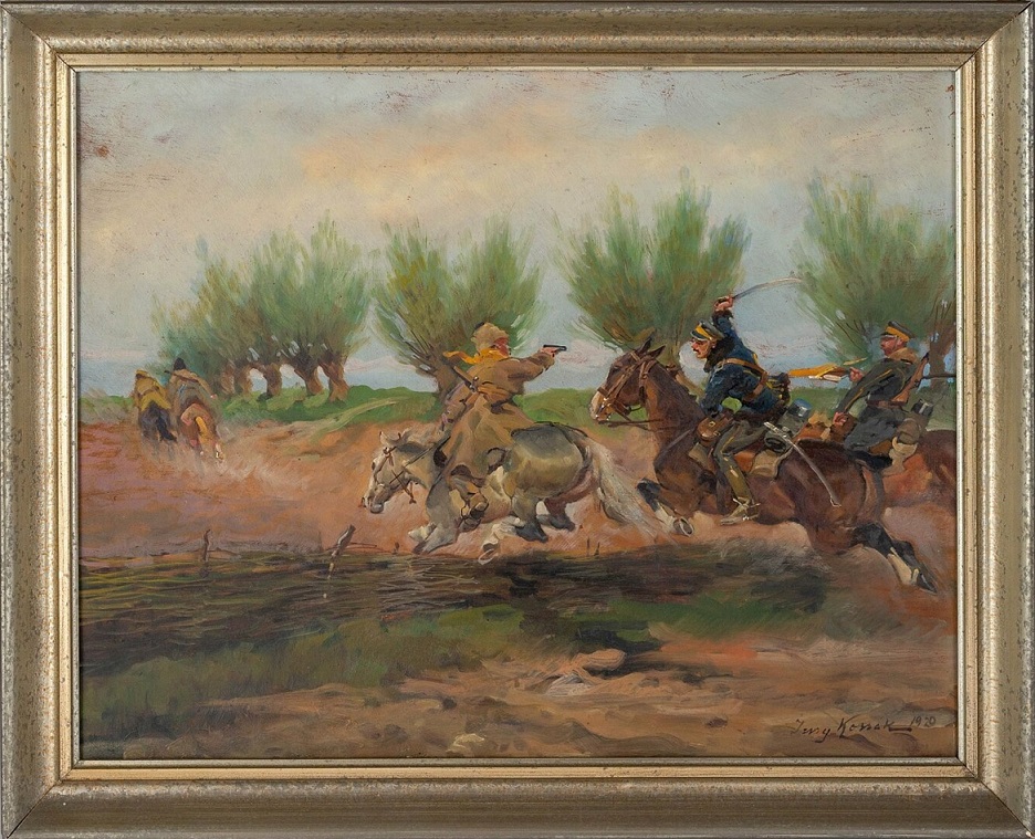 Lot 536. “Polnische Kavallerie in der Schlacht“, Gemälde von Jerzy Kossak (1886-1955). Öl auf Pappe (55x45cm), gerahmt. Polnische Reiter mit gezogenen Säbeln jagen russische Reiter, das Bild rechts unten mit Signatur und Datierung 1920. Jerzy Kossak war ein polnischer realistischer Maler, der sich auf Militärszenen spezialisierte. – Zustand II. Opening 300 euro. Auktionshaus Carsten Zeige. 10/16/21. Sold 4,200 euro