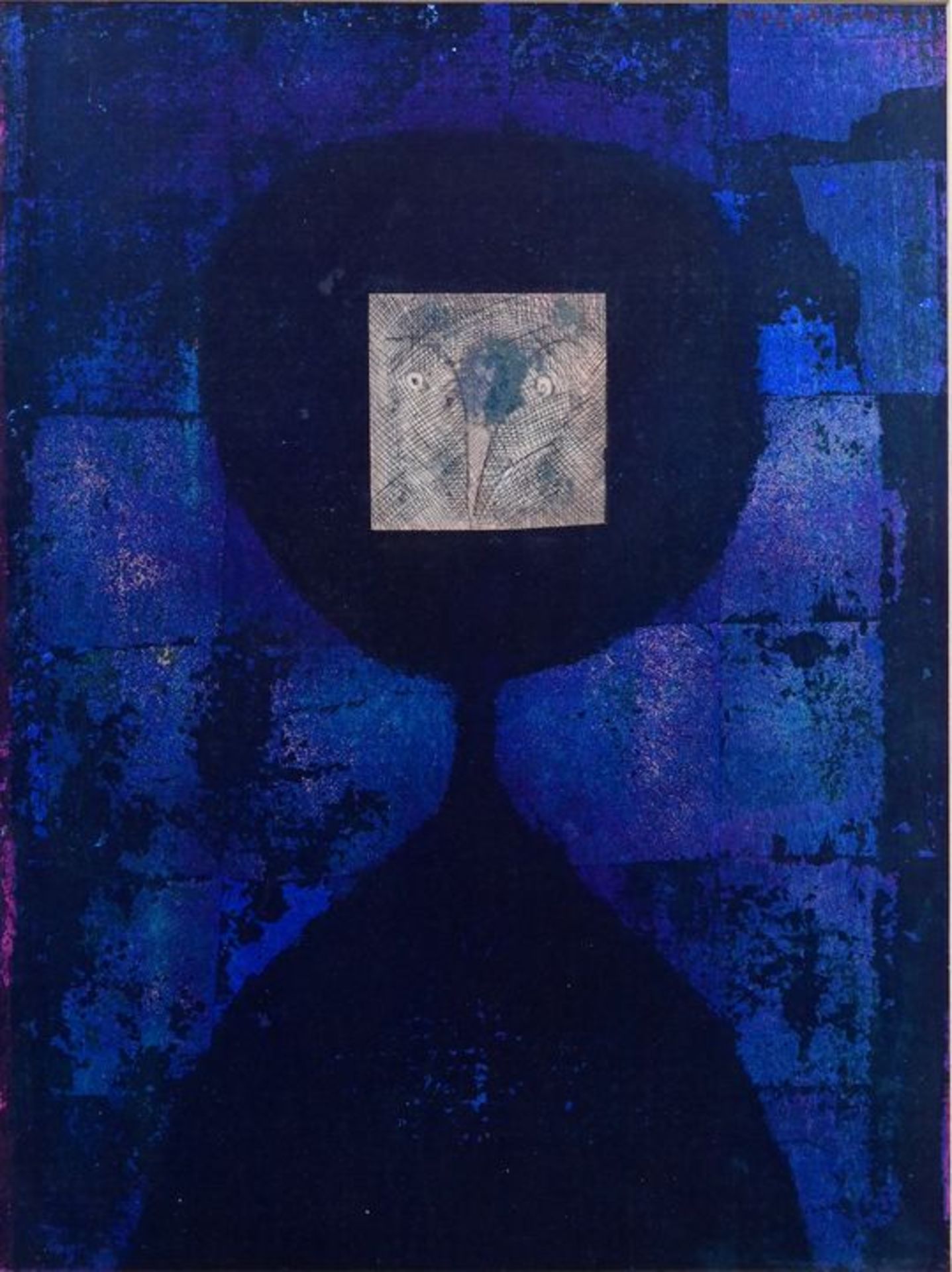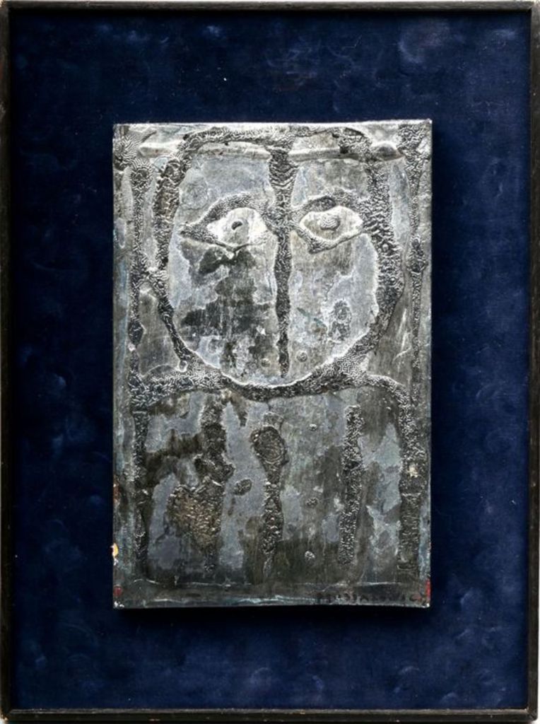 Lot 603. Musialowicz, Henryk. 1914 Gnie’znie-2015 Warschau. Komposition/ Figur/ Objekt. Aus dem Zyklus “Portret z wyobrazni” (Porträt aus der Vorstellung), 1983. Mischtechnik/ individuelle Technik auf starker Holzplatte, re. u. sign. Auf mit dunkelblauem Samt bezogener Holzfaserplatte mit Schwarzer Leiste gerahmt. Min. Schaden li. Rand. Verso handschriftl. vom Künstler bezeichnet Z CYKLU PORTRET Z WYOBRAZNI / 25 x 16/ 4 SZ/ MUSIALOWICZ/ 1983. Nachlass(?)stempel. 25 x 16 cm/ 38 x 27,5 cm. Henryk Musialowicz (1914-2015 Warschau): Untitled. From the cycle PORTRET Z WYOBRAZNI, 1983. Mixed media on wooden panel, mounted on composite board. Enscribed at reverse Z CYKLU PORTRET Z WYOBRAZNI / 25 x 16/ 4 SZ/ MUSIALOWICZ/ 1983. Opening 1,200 euro. Dresdner Kunstauktionshaus. 09/18-21/21