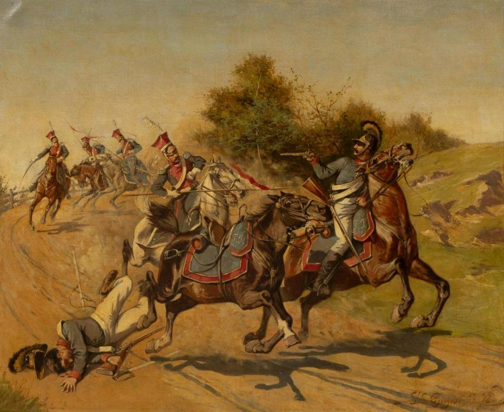 Walka polskiego lansjera z Prusakiem (?). Za dwadzieścia lat będą w twórczości Stanisława Bagieńskiego dominowały na płótnie walki polskich kawalerzystów z bolszewicką zarazą.