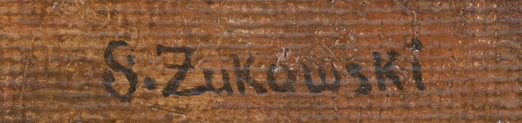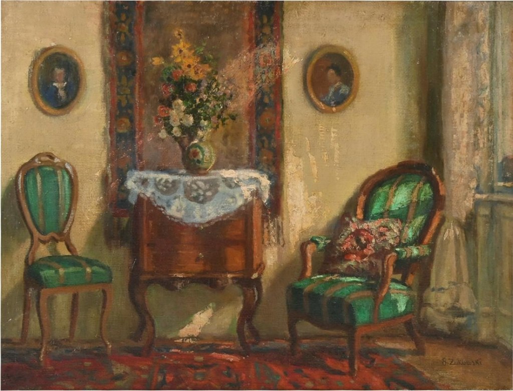 Lot 163. STANISLAV YULIANOVICH ZHUKOVSKY (Russian, 1872/75-1944), Interior Scene, oil on canvas, canvas: 23.75 x 31.5 inches; overall with frame: 28.5 x 36.25 inches, signed lower right: ‘S. Zukowski’, remnants of a label verso lower right corner (no text). Estimate $2,500 – 3,500. Michaan’s Auction. 10/16/21