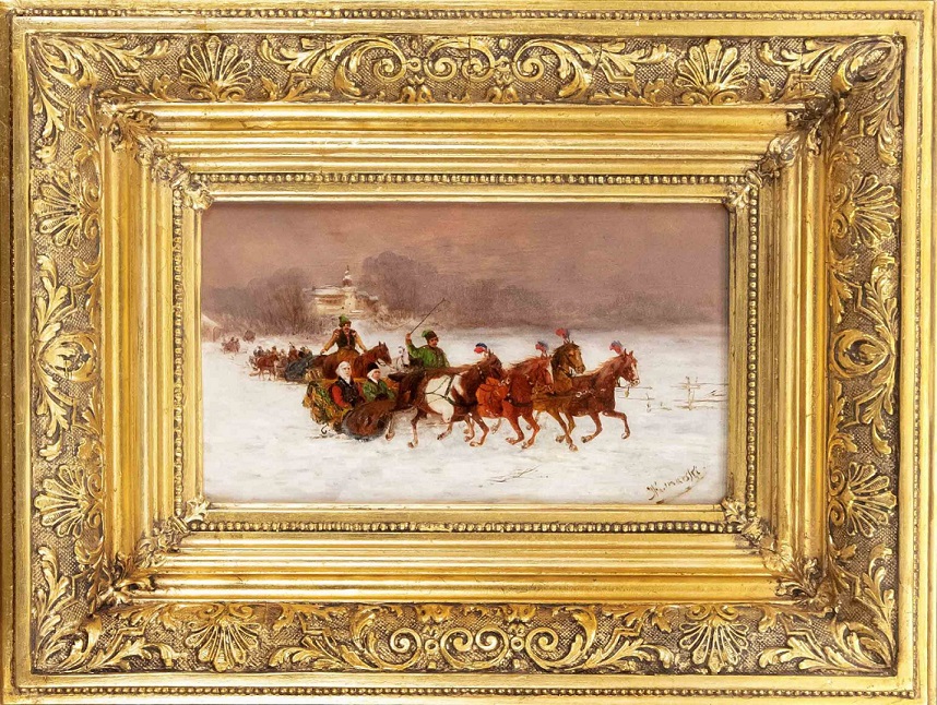 Lot 7362. Sign. Konarski, polnischer Maler des 19. Jh., ”Schlittenfahrt in Podolien”, Öl auf Holz, u. re. sign., verso auf altem Etikett handschrftl. aud dt. betitelt”, 16 x 26 cm, ger. 35 x 45 cm. Opening 300 euro. Historia Auktionhaus. 11/02-08/21