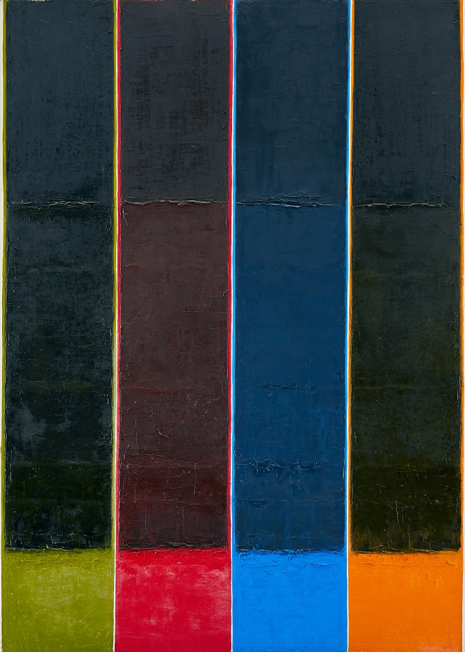 Wkraczam na bardzo niebezpieczny teren, tj. sztukę abstrakcji, sztukę współczesną. Nie potrafię ocenić, czy ta praca jest bardzo dobra też czy bardzo słaba. Widzę jedynie, że ok. 1/4 od góry farba się łuszczy przez całą szerokość, czyli płótno jest zniszczone. Może to jednak celowy efekt artysty?