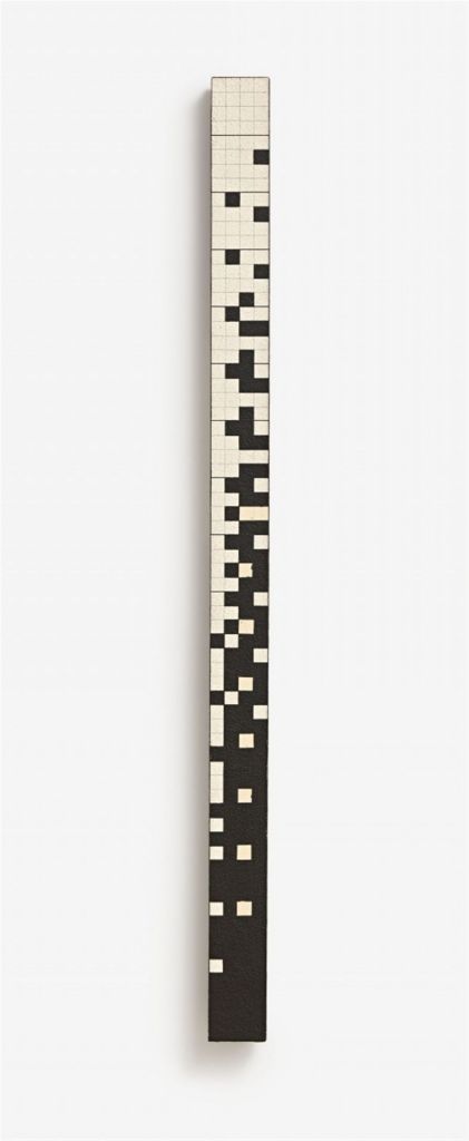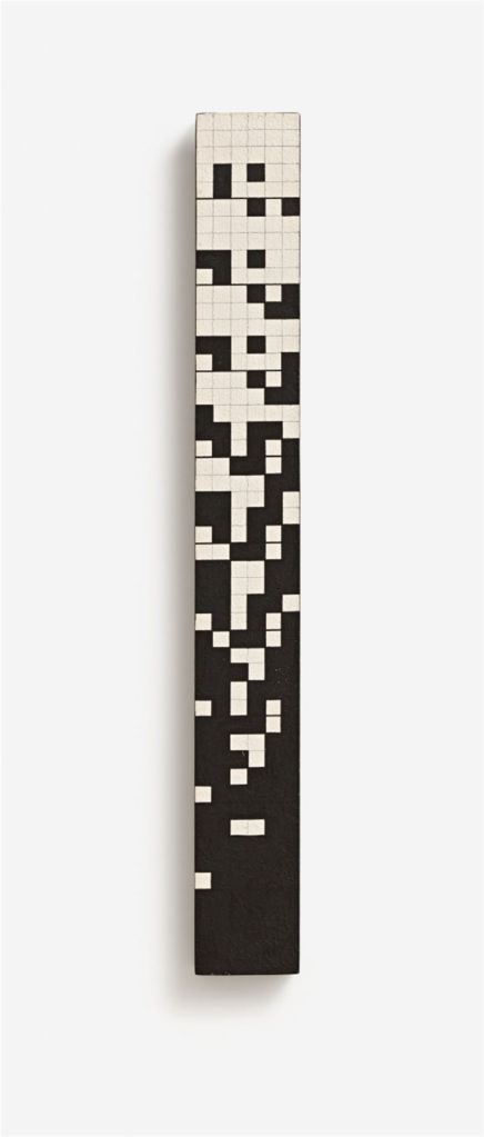 Lot 422. Ryszard Winiarski, Chance in vertical game 4 x 4. Acrylic and paper collage on wood 68 x 4 x 2 cm. Signed, titled and inscribed ‘chance in vertical game 4 x 4 winiarski with mistake’ verso on wood (in Polish) and on adhesive label (in English), with direction arrow. Dated ’82’ verso on wood. – Traces of studio and minor traces of age. Provenance: Galerie Alf Krister Job, Mainz; private collection, Rhineland-Palatinate. Estimate 5,000 – 7,000 euro. Lempertz. 12/04/21. Not sold