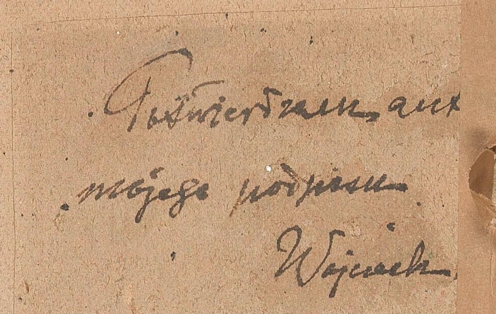 Zauważyłem, że końskie ‘główki’ w wykonaniu Wojciecha Kossaka cieszą się coraz większym powodzeniem w Polsce a ich ceny osiągają 30,000 złotych. Obecna praca z Dorotheum jest dość szkicowo potraktowana i może dlatego artysta zmuszony został do potwierdzenia na odwrociu swojej sygnatury. Takie potwierdzenia znaleźć można dość często co było również wynikiem powstawania falsyfikatów już za jego WK. Obraz wygląda namalowany na płótnie naklejonym na karton a nie na bezpośrednio na kartonie. Być może obraz był nieco przycięty do ramy o czym może świadczyć to przycięte potwierdzenie na odwrociu. Sporo prac Wojciecha jest obecnie na rynkach zagranicznych i te znajdą zainterowanie u kolekcjonerów.