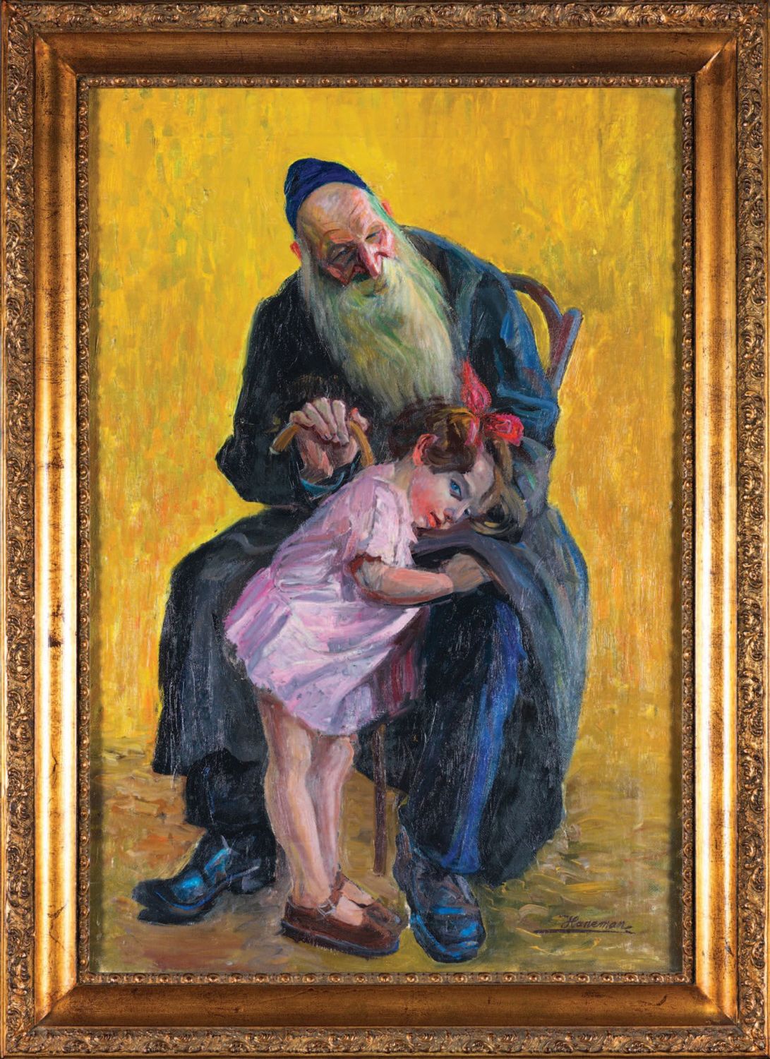 Lot 208. MAX HANEMAN (1882-1941/44?). Grandfather and granddaughter. Poland, ca. 1930. Oil on panel. Signed lower right. H_73 cm W_49 cm. Maks Haneman was born in 1882 in Lodz and began studying at the Academy of Fine Arts in Krakow in 1907 as a disciple of Leon Wyczolkowski and Teodor Axentowicz. After spending several years at the university and three years at the Warsaw School of Fine Arts, he returned to the Krakow Academy of Fine Arts, where he graduated in 1920. He travelled twice to Palestine, which had a strong influence on his work. Views of the holy places of the three monotheistic religions were present in the many exhibitions of his paintings in Poland (Lodz, Krakow, Warsaw). He lived for a time in the Polish Tatras in Zakopane and painted landscapes inspired by this region. At the outbreak of the Second World War, he returned to Lodz and was deprived of all his property, ending up in the Lodz ghetto, where he probably died between 1941 and 1944. Estimate 1,500 – 2,500 euro. Pierre Berge & Associes. 12/20/21
