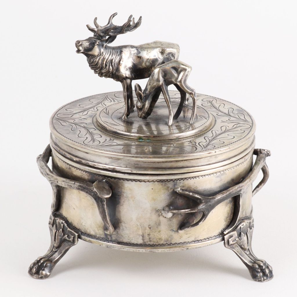 Lot 2791. Russland – Deckeldose Silber, punz. 84 zolotniki, weitere Punze verschl. u. unbekannt, aufwendig gestaltete Deckeldose auf drei reliefierten Tatzenfüßen, runder Korpus m. passendem flachen Scharnierdeckel, auf mittiger flacher Plinthe naturnah gestaltete plastische Darstellung eines röhrenden Hirsches u. eines grasenden Kitzes, umlaufend reicher u. feiner Gravurdekor, Eichenblätter u. Zackenfries, umlaufend ansgesetzte plastische Hirschgeweihe, durchbrochen gearbeitet, feine Kratzer, Alterssp., Hca. 15 cm, Dca. 12,5 cm, Gges. ca. 629g. Opening 1,200 euro. Auktionshaus Franke. 01/27-29/22
