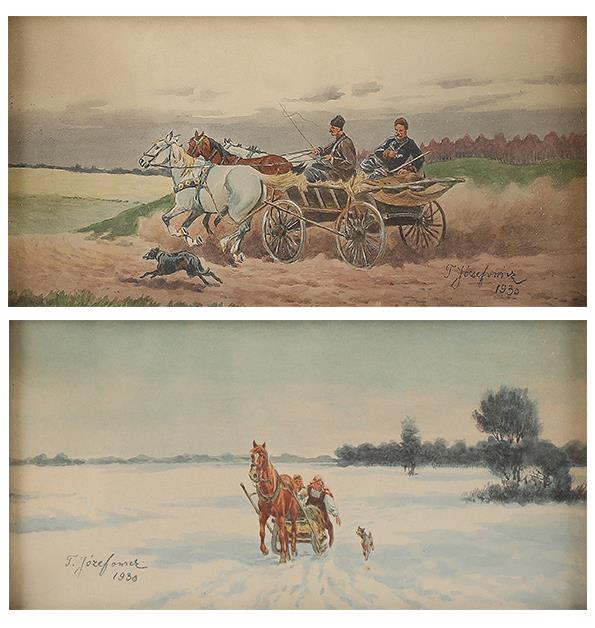 Lot No. 138-075604/0002. T. Jozefowicz, Polen um 1930. Schlitten im Winter und Fuhrwerk nach der Heuernte, beide signiert und datiert T. Jozefowicz 1930, Aquarell auf Papier, 15,5 x 30,5 cm, gerahmt, (2). Starting 320 euro. Dorotheum. 01/25/22
